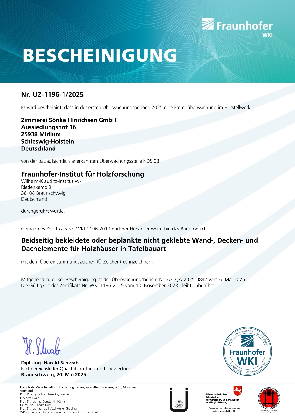 Neben der werkseigenen Produktionskontrolle und der bauaufsichtlich zugelassenen Überwachungsstelle vom Fraunhofer-Institut für Holzforschung Wilhelm-Klauditz-Institut ( WKI ) können wir eine sehr gute Qualität gewährleisten und dürfen unsere produzierten Elemente mit dem Ü-Zeichen versehen.